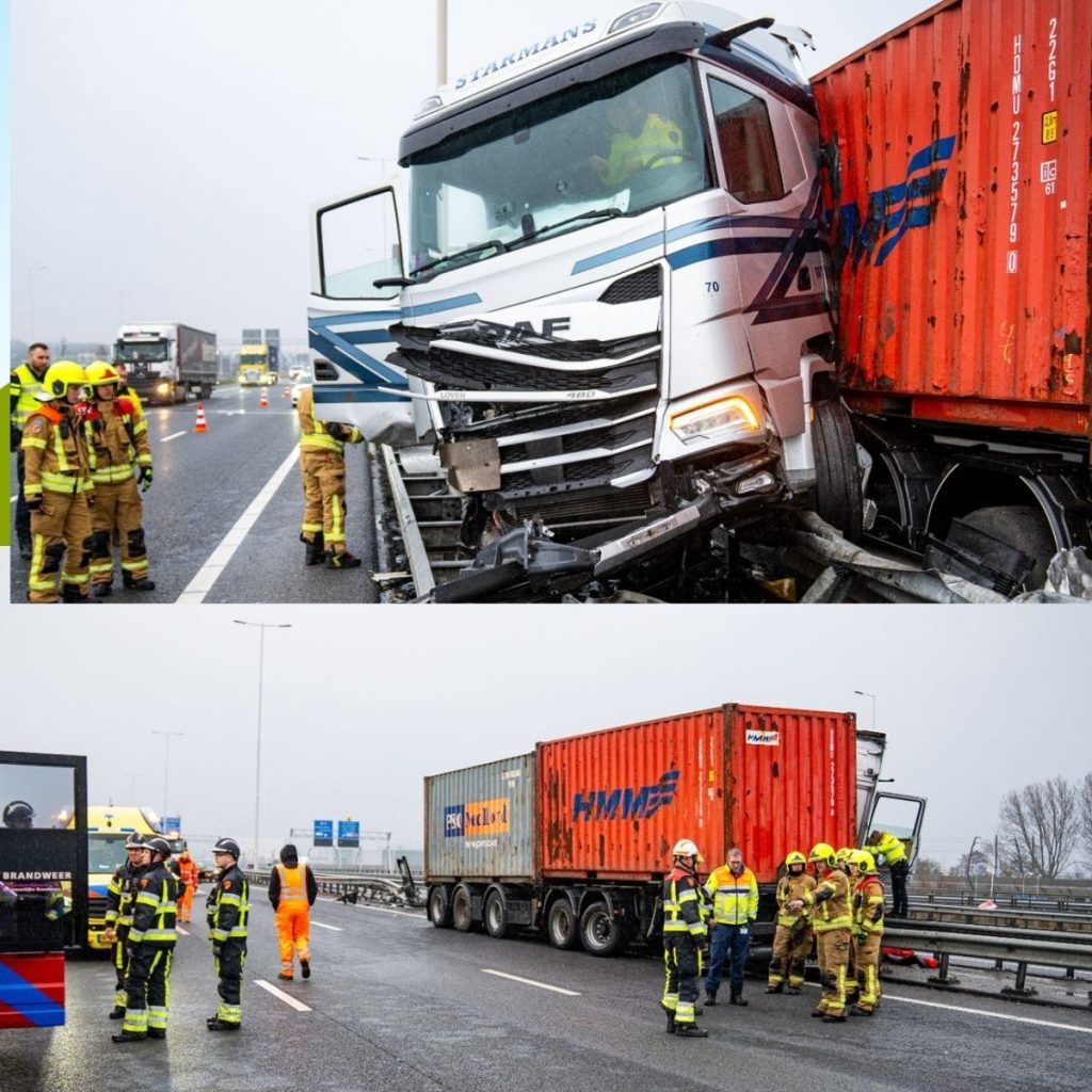 De vrachtauto is tegen de linkervangrail gebotst, waardoor ook het verkeer uit de andere richting hinder kan ondervinden. Verkeer kan de rechterparallelbaan gebruiken om langs het ongeluk te raken.