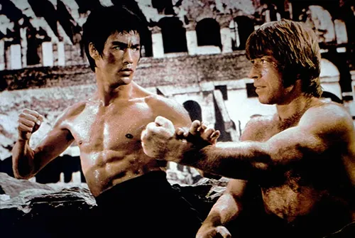 Chuck Norris in 2012 in The expendables 2.Bruce LeeVoor filmliefhebbers is Norris vooral beroemd vanwege zijn schurkenrol inThe way of the dragon (1972),van de legendarische Bruce Lee. De twee stonden in die film tegenover elkaar in het Colosseum in Rome, in een van de beroemdste gevechten uit de filmhistorie. Er wordt vaak gespeculeerd wie een echt gevecht tussen de twee gewonnen zou hebben.Voor zijn carrière als filmster kende Chuck Norris een lange loopbaan als vechtsporter. Hij had een zwarte band in karate en won tal van kampioenschappen (hij werd onder meer zes keer wereldkampioen karate). Ook excelleerde hij in diverse andere vechtsporten zoals taekwondo, judo en tang soo do, een Koreaanse vorm van karate.GrappenChuck Norris kreeg online een cultstatus vanwege tal van grappen die rondgingen over zijn ‘onoverwinnelijkheid’, zoals: ‘Toen Chuck Norris in aanraking kwam met het coronavirus werd het virus in quarantaine geplaatst’. En: ‘Als Chuck Norris push-ups doet, duwt hij niet zijn lichaam omhoog maar de aarde omlaag’.Zelf deed Norris overigens graag aan al die grappen mee enlas ze voorop zijn eigen sociale media of in tv-shows.
