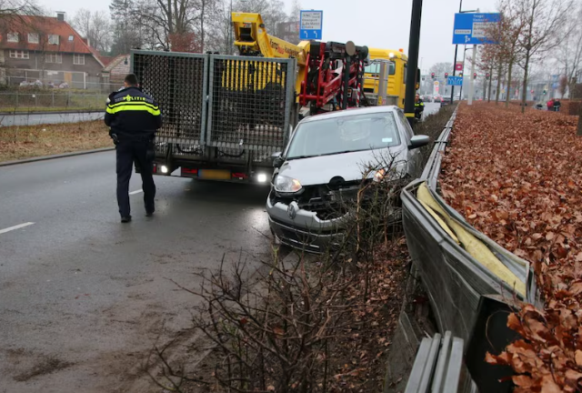 Auto zit na aanrijding in Apeldoorn klem tussen vrachtwagen en vangrail
