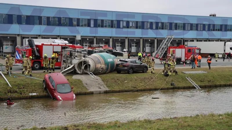 Cementwagen kantelt in Aalsmeer en duwt auto het water in, chauffeur opgepakt
