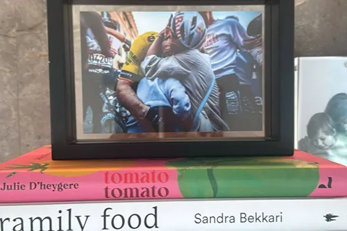 De foto die boven de kookboeken van Sandra Bekkari hangt: vrouw Sarah legt uit waarom Siena zo belangrijk is voor Wout van Aert