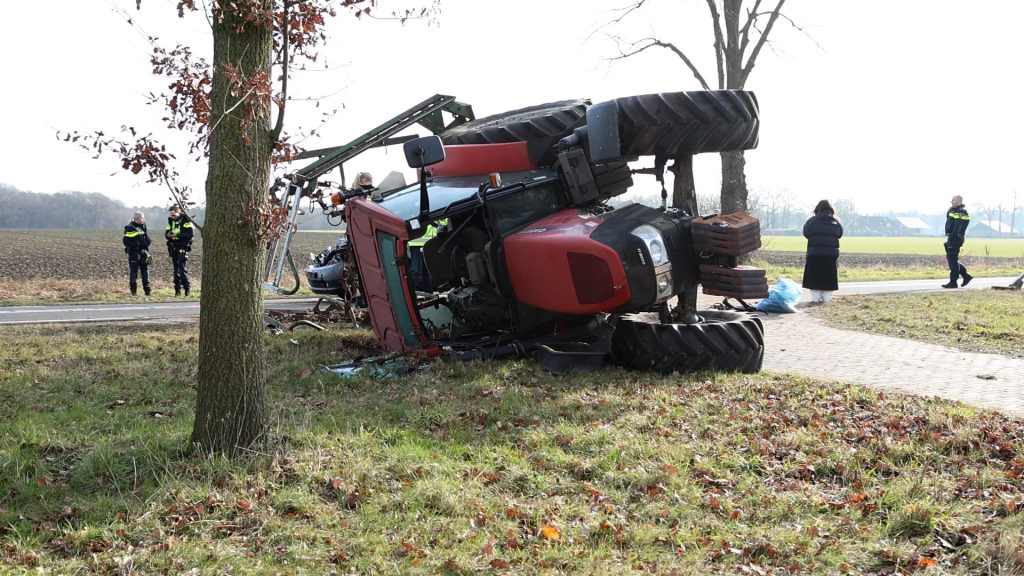 Een trekker en auto zijn maandagochtend met elkaar in botsing gekomen op de Stationsweg in Markelo. Het landbouwvoertuig kwam door de klap op de zijkant terecht. De bestuurder van beide voertuigen zijn door ambulancepersoneel behandeld en hoefden niet mee naar het ziekenhuis.