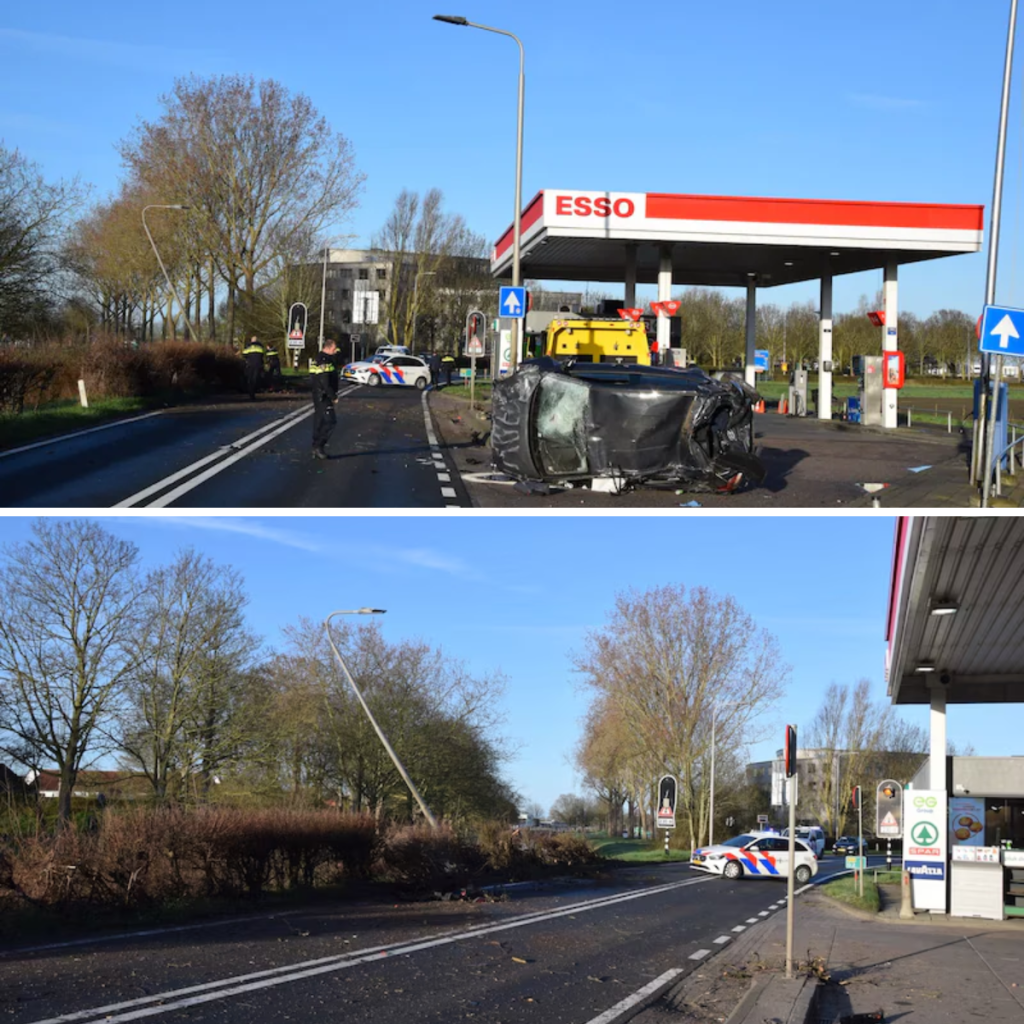 Een bestuurder vloog rond 07.30 uur met zijn auto uit de bocht, ramde een lantaarnpaal en vloog over de kop. De auto kwam meters verder op zijn kant tot stilstand. Ondanks de grote schade wist de bestuurder zelf uit de auto te klimmen.