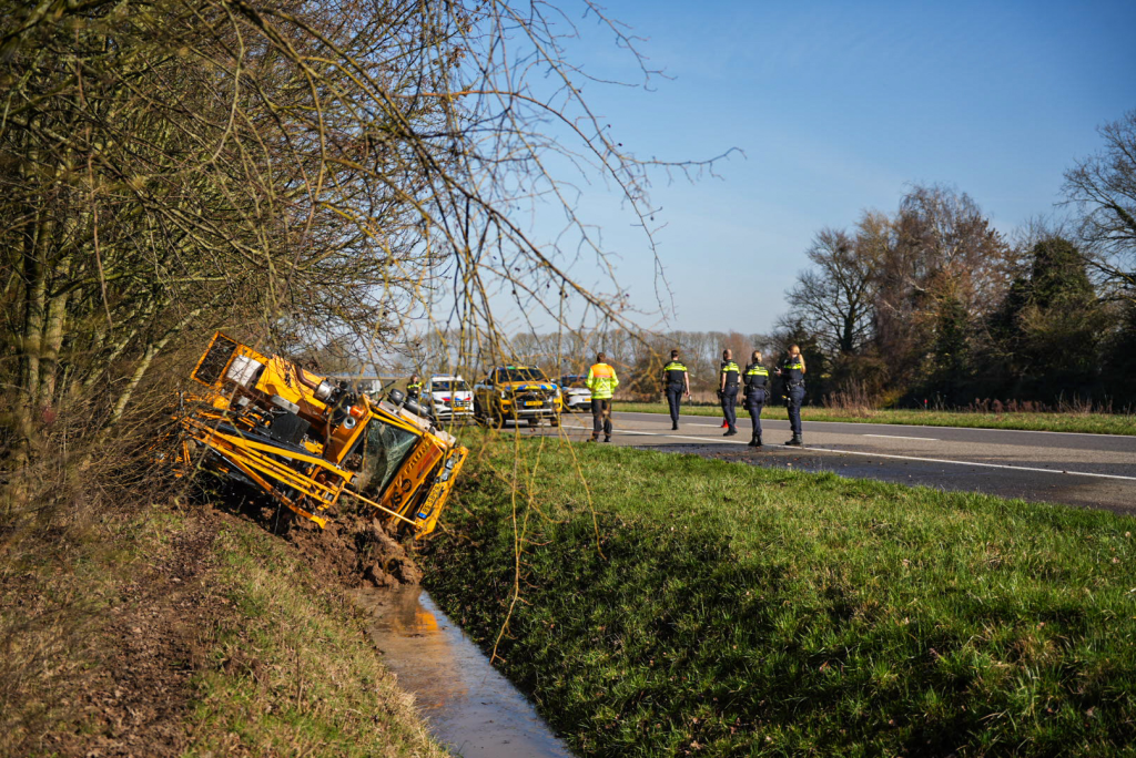 Rond 11.00 uur kwam de melding binnen, waarna hulpdiensten werden gealarmeerd. De hijskraan was door nog onbekende oorzaak van de weg geraakt en op de zijkant in de sloot terechtgekomen. De cabine raakte daarbij zwaar beschadigd. De bestuurder kon zelfstandig uit het voertuig stappen en is door ambulancepersoneel nagekeken. Hij bleek niet gewond.