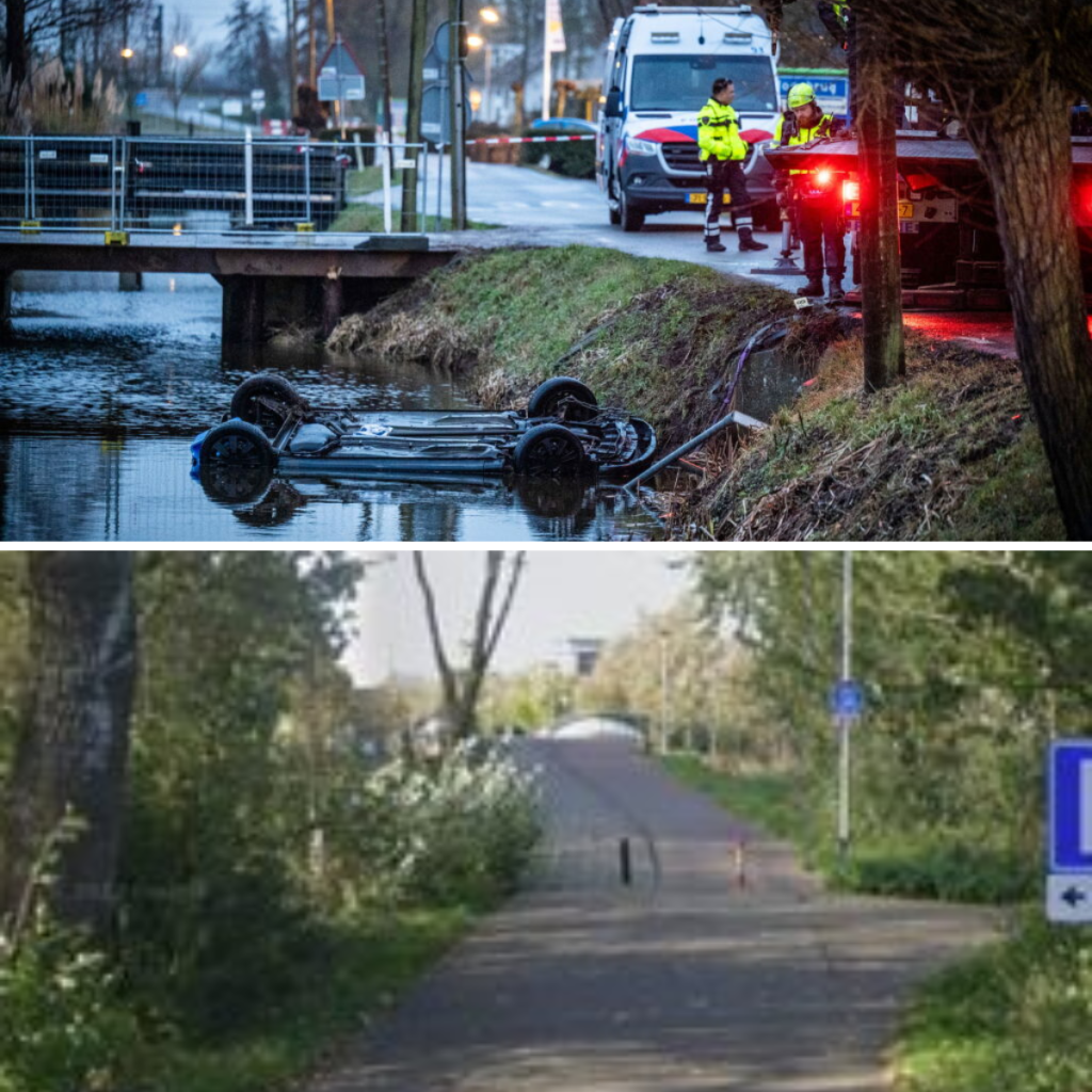 De politie onderzoekt nog hoe het ongeluk kon gebeuren. ‘Daarbij liggen alle scenario’s nog open’, zegt een woordvoerder. De weg is afgezet en de auto ligt op z’n kop in het water.