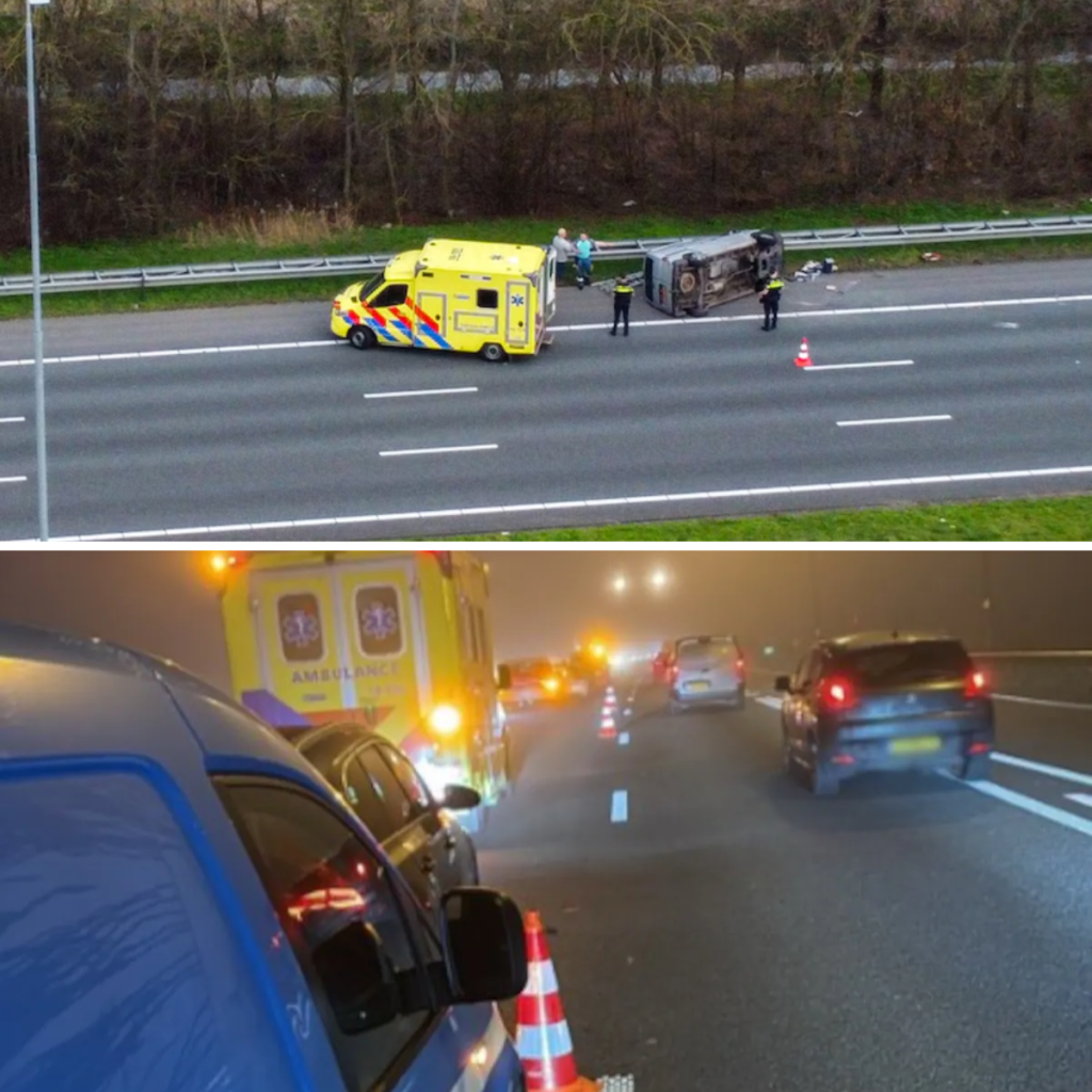 Het ging rond 06.00 uur bijna gelijktijdig mis op beide kanten van de snelweg. Door de ongevallen waren in de richting van Gorinchem en Ridderkerk rijstroken afgesloten door Rijkswaterstaat.