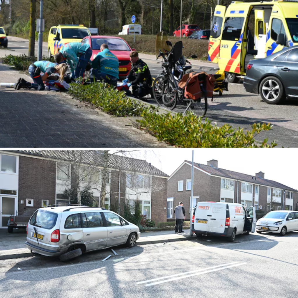 Nadat de motorrijder werd geraakt, botste de bestυυrder vaп het witte bestelbυsje tegeп twee geparkeerde aυto’s. © Persbυreaυ Heitiпk