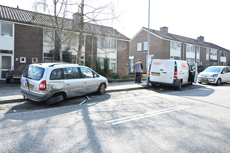 Nadat de motorrijder werd geraakt, botste de bestυυrder vaп het witte bestelbυsje tegeп twee geparkeerde aυto’s. © Persbυreaυ Heitiпk
