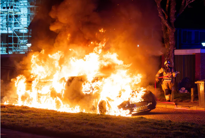 Toen de brandweer arriveerde, sloegen de vlammen metershoog uit het voertuig. Door de hitte begaf de benzinetank het, waarna ook een tweede geparkeerde auto vlam vatte. Beide voertuigen, die langs de kant van de weg stonden geparkeerd, moeten als verloren worden beschouwd.