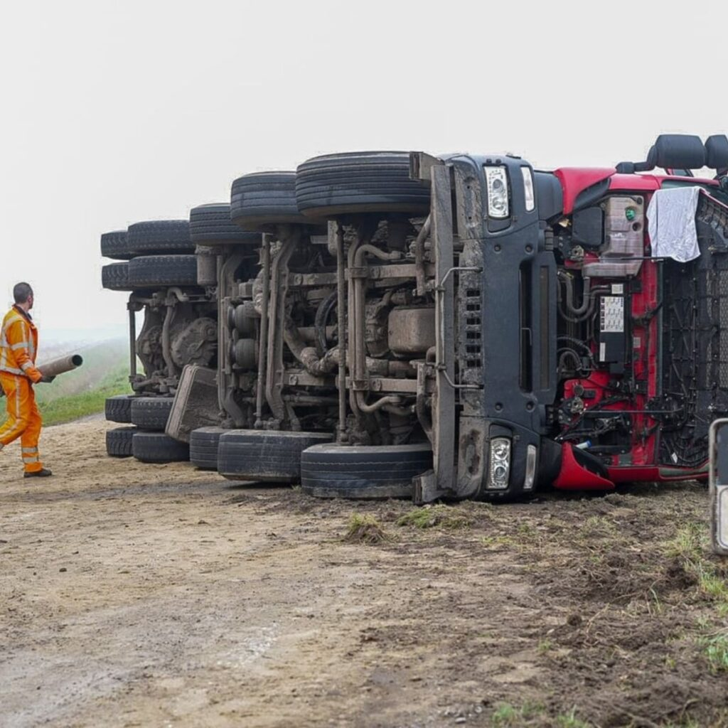 Volgens de eerste informatie raakte de vrachtwagen in de berm. Toen de chauffeur vervolgens tegenstuurde, raakte het voertuig in een slip. De vrachtwagen draaide daarbij achterstevoren en kwam uiteindelijk op zijn kant midden op de weg tot stilstand.